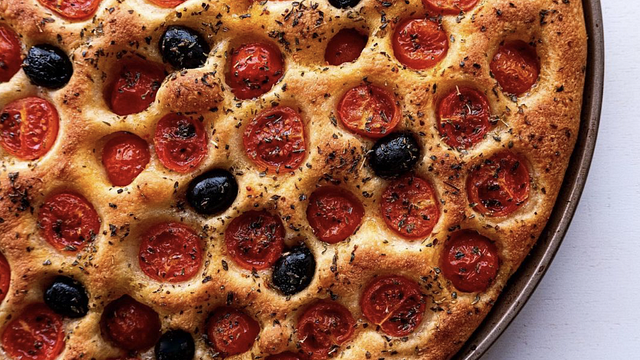 Impastare fino a quando non si ottiene un panetto e lasciarlo lievitare per 2 ore. Stendere l’impasto in una teglia e lasciare lievitare per mezz’ora. Condire la base con pomodorini pachino, olive nere e origano. Lasciare lievitare per un'ora e mezza e infornare a 200 gradi, mettendo per i primi 15 minuti in cottura nella parte più bassa del forno e altri 12 minuti vicino al grill superiore.