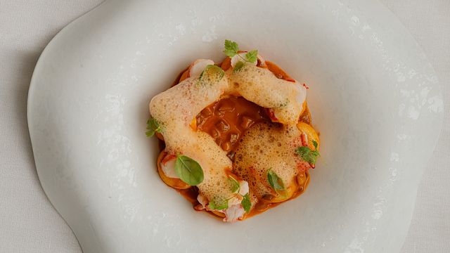 Appoggiare gli gnocchi nel piatto, mettere al centro il ragù di creste di gallo, bagnando anche gli gnocchi. Poggiare l’astice scaloppato sopra gli gnocchi e concludere con un’aria di bisque legata con la lecitina di soia.