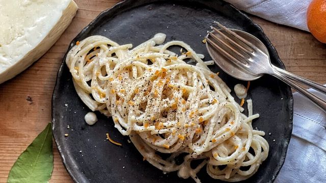 C’è chi propone la mantecatura in ciotola e chi in padella, chi mette l’olio e chi no, chi la prepara cremosa e chi un po’ più granulosa, chi mette solo pecorino e chi un mix di formaggi, insomma, nei limiti, ognuno fa un pò come vuole, in realtà sono solo due gli ingredienti fondamentali: pecorino romano e pepe. Ecco una versione che profuma di mandarino.
