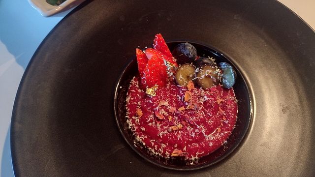 - Terminare con mirtilli e fragole e una grattugiata di cioccolato bianco, a piacere decorare con petali di rosa commestibile e oro alimentare