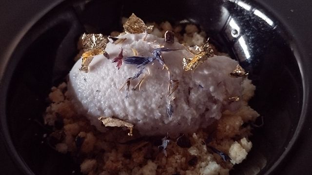 Aggiungi una quenelle di gelato di violetta sopra lo strato di biscotti di riso in ogni bicchiere o ciotola. Assicurati che il gelato sia ben posizionato al centro.