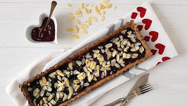 Farcisci la base della crostata con la confettura poi aggiungi le mandorle sfilettate. Cuoci in forno statico a 175°C nel primo ripiano in basso per circa 35-40 minuti. Sforna la crostata, lasciala raffreddare completamente prima di toglierla dallo stampo.