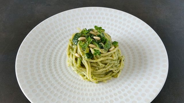 Questa ricetta è una versione creativa dei classici spaghetti al pesto perché ho aggiunto delle zucchine e della maggiorana fresca per dare ancora più profumo e sapore al piatto.