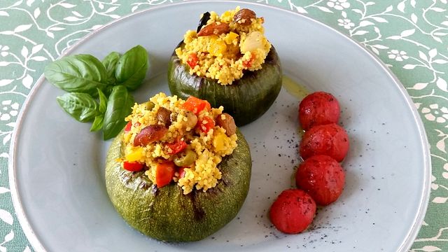 Le zucchine rotonde sono un ortaggio molto bello da servire. Le verdure ripiene possono essere un piatto creativo che si può preparare anche in versione veloce e semplice. Io le ho farcite con un couscous speziato molto facile da preparare anche all'ultimo minuto. Le zucchine si possono riempire anche con il riso, con la quinoa o con un mix di legumi. Si può rendere questa ricetta un perfetto piatto del riciclo usando una insalata di riso già pronta o del riso lessato farcito con sott'oli o sott'aceti che abbiamo già aperti in frigorifero.
