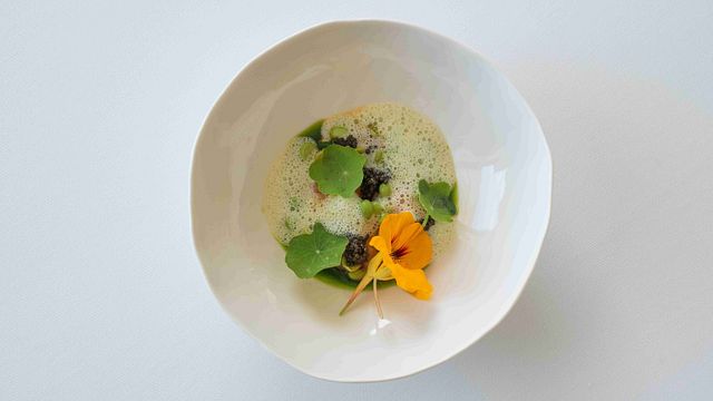 La cucina di Enrico Marmo, executive chef del ristorante 1 Stella Michelin Balzi Rossi di Ventimiglia (IM), è istintiva. Nel piatto, c’è spazio per il meglio che la natura sa offrire, qui, in quest’ultimo lembo di terra ligure, a soli 400 metri dal confine francese. Due sono i mondi maggiormente valorizzati nelle portate dell’unico menu degustazione Momento, costruito a mano libera secondo la creatività dello chef e la disponibilità del mercato. Gamberi, piselli e caviale è un piatto che si inserisce alla perfezione in questa filosofia di cucina. I gamberi sono quelli viola di Sanremo, i piselli, anch’essi locali, conferiscono freschezza vegetale al piatto e il caviale ricchezza.
